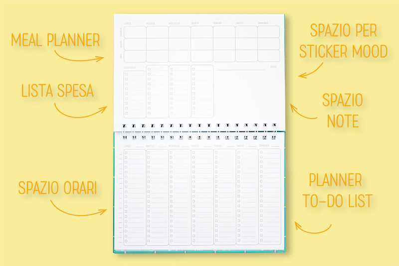 Nella pagina inferiore invece troverai l'organizzazione della tua settimana in to do list, con tanto di colonnina di orari per renderlo ancora più aderente alle tue esigenze.