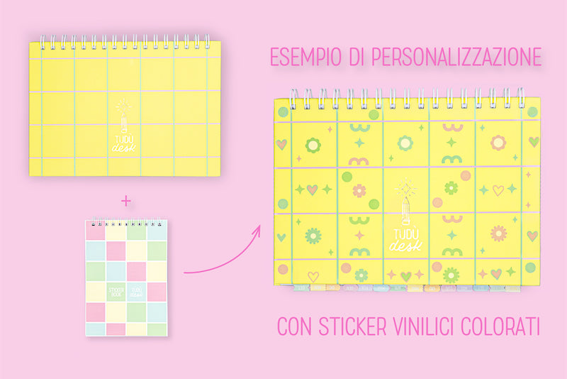 Con ogni tùdù desk è compreso nel prezzo LO STICKER BOOK TÙDÙ DESK: un libretto di adesivi che renderà il tuo planner da tavolo ancora più unico e colorato.