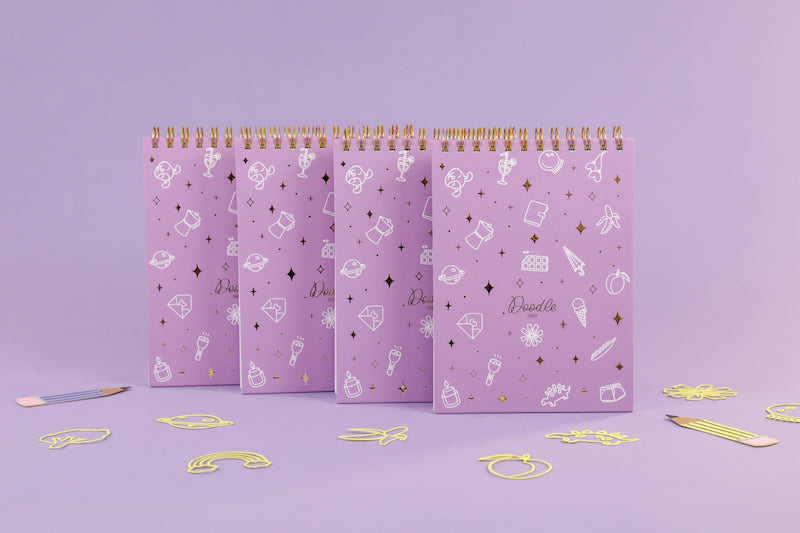 DOODLE DIARY è un quaderno A5 con spirale sul lato corto (così da non essere di impedimento alle persone mancine), con copertine cartonate con sensazione soft touch ed elementi in oro 3d, 140 pagine di esercizi guidati in carta 140 gr (perfette anche per i pennarelli!) divise in 4 capitoli con diverse finalità.