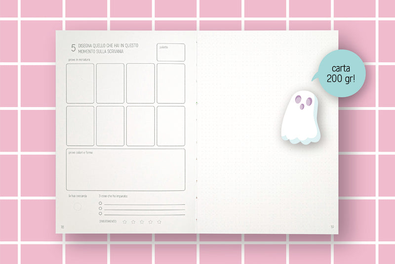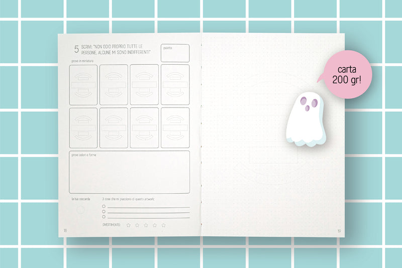 Ha 128 pagine e, grazie ai materiali di cui è composto, è personalizzabile tramite disegno o pittura in ogni sua parte: abbiamo voluto creare un blocco bianco che tu possa riempire con tutta la tua creatività, ma che fosse tecnicamente molto performante.