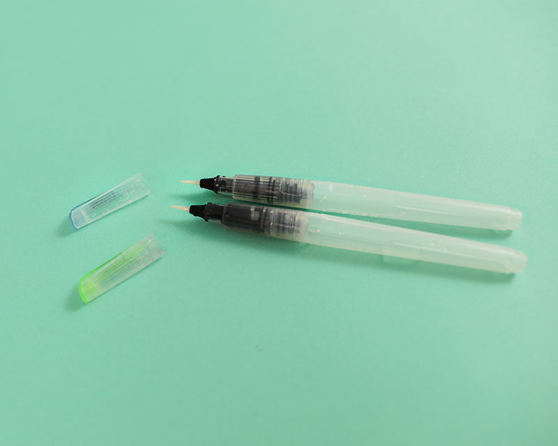 - 2 water brush Marvy Uchida, ossia due pennelli con serbatoio d’acqua molto comodi anche da portarsi in giro per acquerellare in libertà, uno con punta fine ed uno con punta media