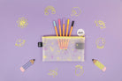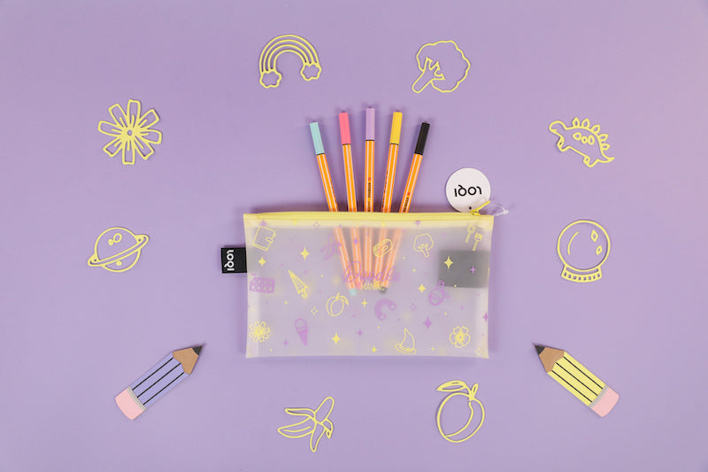 Dentro ad un bellissimo Astuccio LOQI Zip mini Pocket trasparente troverai 5 Penne STABILO point 88 nelle tonalità: nero, menta, lilla, giallo e corallo!