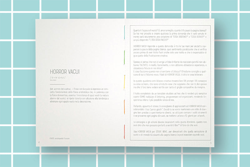 A metà tra un quaderno ed un eserciziario HORROR VACUI è un volume che non solo contiene 57 PROMPT, ossia di dice COSA scrivere in 57 pagine, ma accompagna a questa caratteristica un TEMPLATE appositamente sviluppato per la progettazione di ogni lettering, e CARATTERISTICHE TECNICHE che rendono davvero un piacere disegnarci sopra.