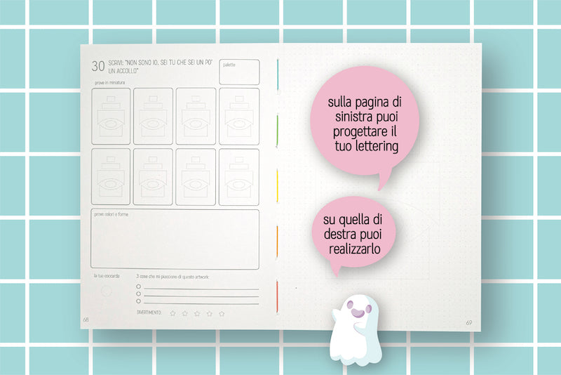 Sulla pagina a sinistra troverai sempre un template per progettare il tuo lettering, la pagina a destra sarà invece quella dove realizzare il vero e proprio artwork.
