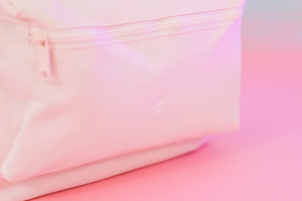 La tasca davanti riporta il nostro logo ricamato in bianco ed è super capiente, e nella sezione principale trovi una comodissima tasca per computer portatile fino a 15 pollici, ovviamente il tutto foderato della stessa nuance di rosa dell'esterno, perchè ci piacciono le cose fatte per bene!